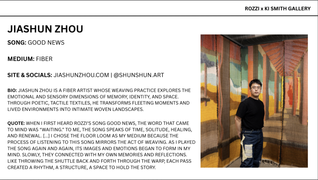 In September 2025, the Ki Smith Gallery in New York, NY hosted an art exhibit of works inspired by songs from Rozzi’s then unreleased Fig Tree album. 26 artists were hand-selected by Julian Lennon, Gia Coppola, Kiersey Clemons, Simon Le Bon and Simon Shaw each paired with tracks to create an interdisciplinary dialogue between art and music.