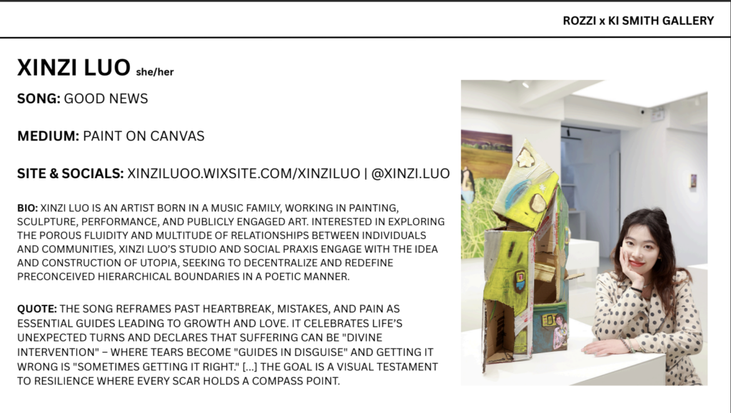 Jiashun Zhou and Xinzi Luo were the two artists chosen to represent “Good News.” See their pieces below along with their comments on how they were inspired by Rozzi’s music. Stay tuned for details on works chosen to represent “Good News” and more for her LA gallery events planned for May (5/14, 5/21, 5/28) and June (6/4, 6/11) that will also include a live performance by Rozzi.